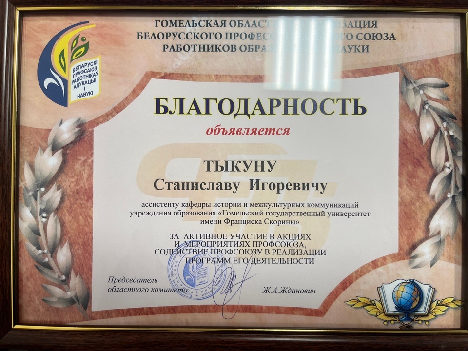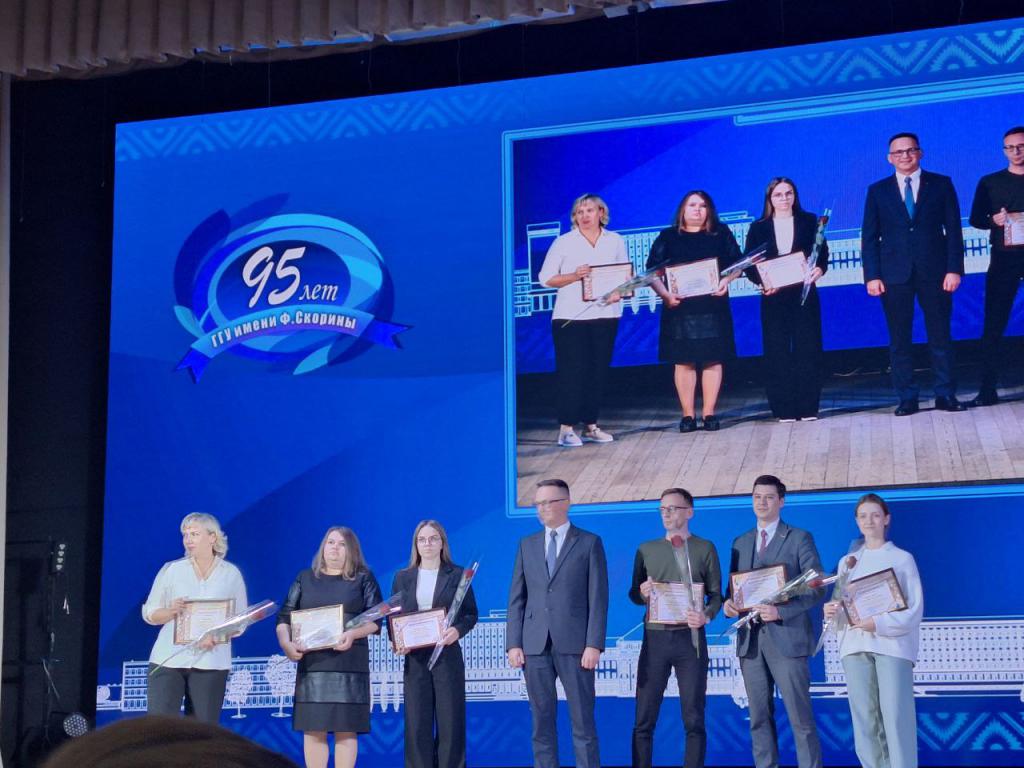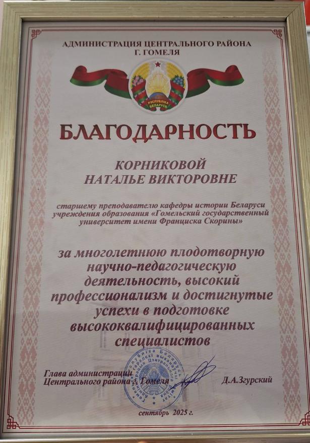 На расширенном заседании Совета университета преподаватели кафедры истории Беларуси Корникова Н.В. и Тыкун С.И. были награждены Благодарностями в честь 95-летия Гомельского государственного университета имени Ф. Скорины, за многолетний труд и содействие профсоюзной деятельности соответственно.
