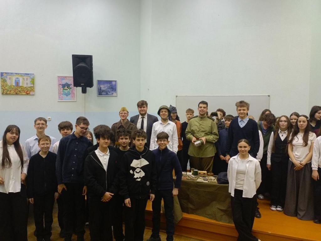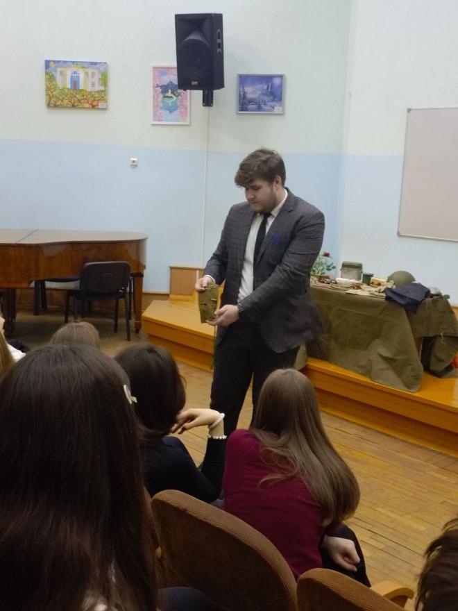 Главной особенностью урока стало «погружение» в эпоху. Один из студентов предстал перед школьниками в аутентичной форме бойцов Красной Армии периода Берлинской операции.